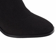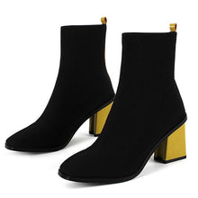 Aino black boots are the new super basics to add to your booties collection. These ankle boots have yellow heels that are bound to uplift any outfit worn over. Trendy boots always manage to make their way into edgy fashion adopters' wardrobes, and just as easily into blogger fashion. The socks like exterior over a solid structural black body makes this stand out from other black shoes lying in one's collection. But the eye catching, head turning feature lies in the block heels of these trendy shoes. The refreshing accent of yellow gives this chic style the party look it needs. The classic black pair has a upward tapering heel with strips cut out at the back and a tiny chunk chopped off at the front of the block. A strip of yellow loops over and runs at the back for that extra quirky style. Fashionistas love boots with heels, perfect as college style too. Edgability.com strives to present the most unique styles in trendy footwear at affordable prices to women who shop online.