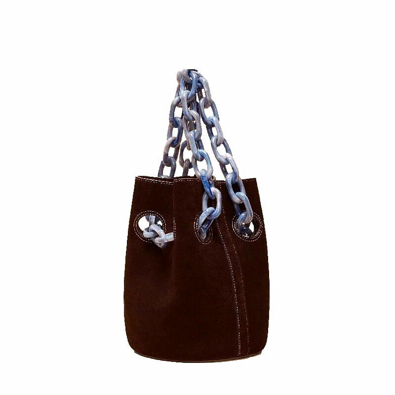 Alana black bag is the perfect handbag for a boss lady. The luxe look lies in the edgy fashion details of the bucket bag. The leather like glossy PU has a fine finish as well as white running stitch to emphasize on the the classy bag. There are holes within the formal bag through which pass the blue linked handles. The giant links are made up of smoothly finished PU too, light in weight and flawless in appearance. The greyish tinge on the blue make for a fine accent against the black, adding the right amount of luxe to a chic style like this shoulder bag. The marble effect on the resin straps add that extra edgy factor to this piece. The shape and size make this an ideal office bag as it would sling on the arms or the shoulders. Fashion bloggers enjoy subtle statement makers as a workwear bag or brunch style purse. Sufficient room within, this arm candy can be a good investment as this season's daily wear formal bag. Edgability.com ensures only the best in trendy bags at affordable prices is made available to women who shop online.