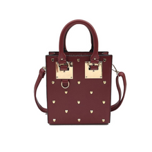 Arlette studded bags are the ultimate statement making classy bags. Women always have at least one staple in their collection that is a classic style, especially this structure. The shape of this trendy handbag can hold notebooks, tablets and many of the daily essentials for the day. There are heart rivets on the front, and solid metallic plates on the back and front that surround the handles, all features that make it an edgy fashion piece. The trendy bag can be carried by the handles or by the long monotoned strap that comes along giving one the option to wear it as a sling bag or crossbody bag. This studs bag is pretty perfect for a date night look. The dark background with gold bits on the front are very chic, one of the biggest reasons for fashion bloggers to adopt this purse.