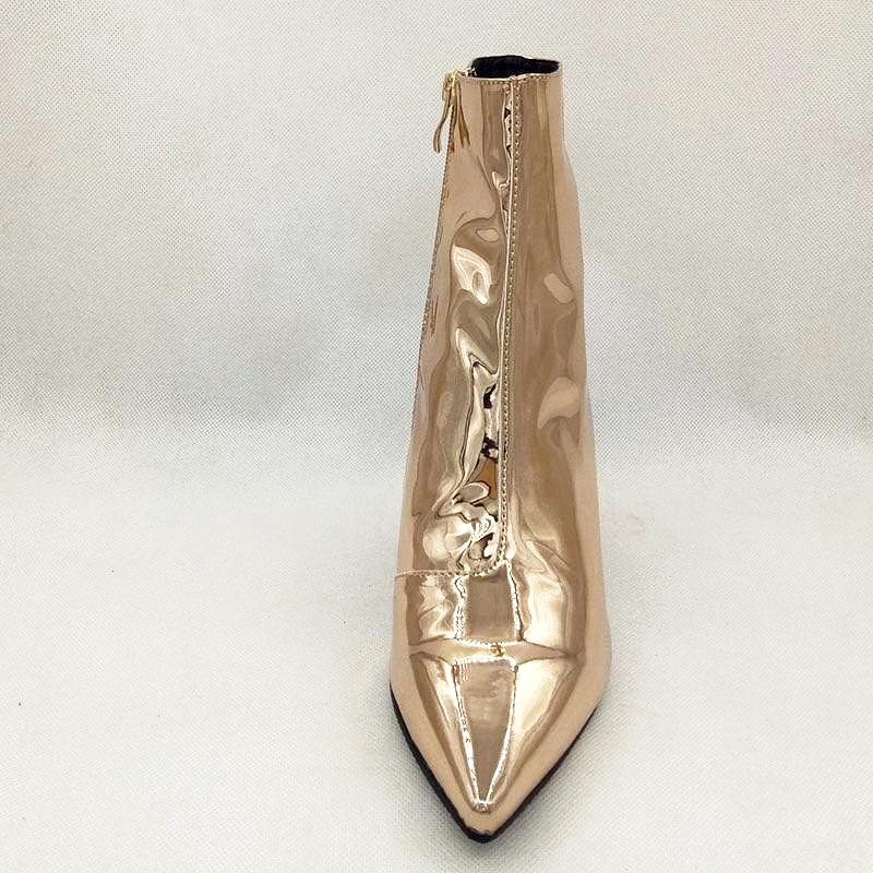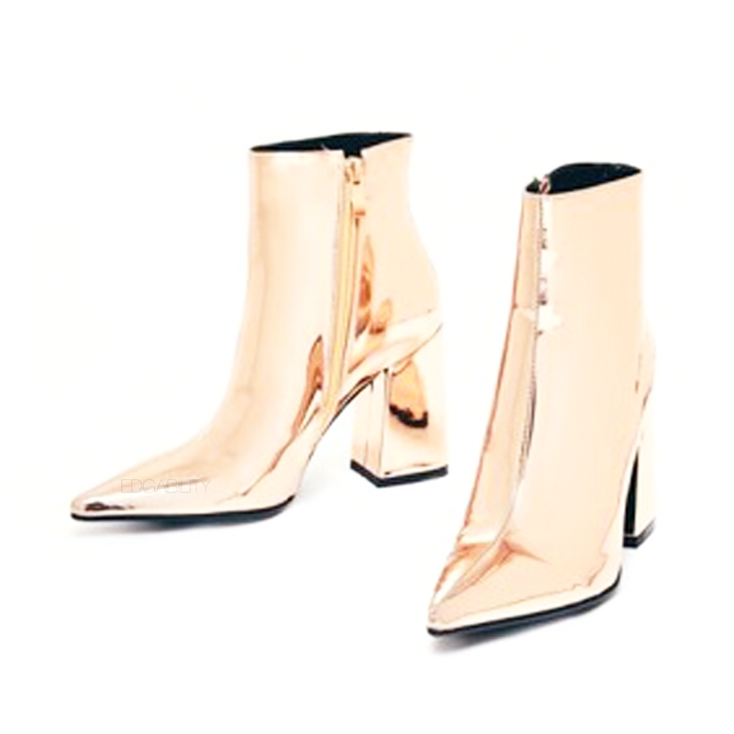 Blanc gold boots are the latest addition to the edgy fashion footwear collection on Edgability.com and the most obvious choice to wardrobes of those who love metallic boots. The block heels are a comfortable option in ankle boots, as they provide stability and support for a long day's wear. The metal sheen on these authentic leather boots ensure compliments every time they're put on. Light bounces off these heeled boots delightfully, unlike any statement maker heels one might own! The front is pointed, giving the body a slimming effect as well as chic style to an ensemble. The zipper runs long from the sole upto the top, so that one can slip right in with ease. The zip lies on the inner sides of the heels, so that the other side has a smooth and reflective surface. These quirky shoes are the perfect party look and rightly so, they're bound to be hits in blogger fashion too. These heeled boots can also be worn as a date night look as they have a classy style, thanks to the gold. Edgability ensures only the best in trendy boots at affordable prices are made available to women who shop online.