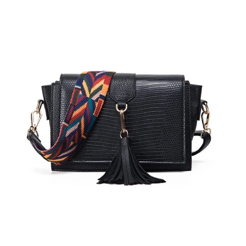 Kesha black bag is essentially an edgy fashion version of the staple classic handbag. This monotoned bag has several features, all, only enhanced in black. The front flap has a snakeskin pattern as a texture, which is exotic not only to look at but also to touch. There is a non functional belt paneled on the top of the purse, onto which a hook is placed, and there, dangles a keychain full of tassels. Of course, the option to switch charms to swing on the front, as per one's whim is always available. But with the detachable colourful strap, it would be perfect to leave it as is. The adjustable strap can be used to wear the formal bag as a sling bag or popularly as a crossbody bag. The shape is of many classy bags, easy to fit into the palms to carry it as a clutch bag. This chic style would make for a great date night look, or even to take it on a night out as a party bag. Because of quirky style, it's only natural that this formal bag would do wonders in blogger fashion. Edgability.com always offers trendy bags at affordable prices to women who shop online.
