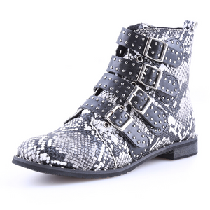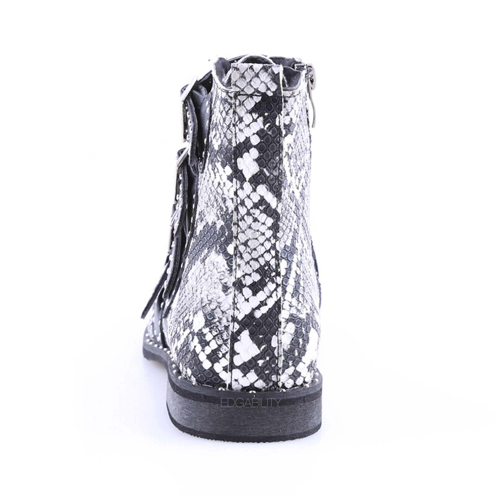 Olympus snakeskin boots are a bold trend in ankle boots currently, as it has all the components of edgy fashion. The snakeskin texture on the PU gives the wearer an upgrade from the usual studded boots. The multiple strap like belts with buckles are placed on the front like accessories, giving the appearance of being wrapped all the way around. These trendy boots have a zipper on the inner facing sides, that allows for easy wearing. A small bit of heel with a rounded toe, offers the shape of a pair of classic boots. The grey and black monotoned colour theme enhance the snakeskin print on these heeled boots. Olympus style black booties are very popular in Europe as it can be spotted on fashion bloggers all over. Edgability always caters to women who shop online for trendy shoes at affordable prices.
